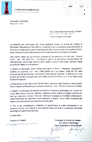 La proposta di un patto di amicizia e collaborazione tra i comuni del Castello di Serravalle, Repubblica di San Marino, Tivoli, Valdobbiadene e Montebelluna, grazie ad Antonio Ciacci (Little Tony)